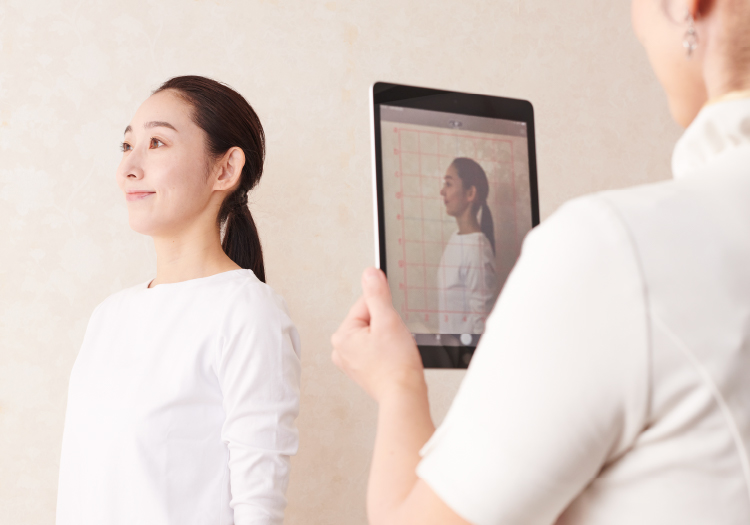 施術前後での違いを確認するため、最初に姿勢とお顔の写真を撮影します。ビフォーアフターを見比べることで効果が目に見えて実感できます。